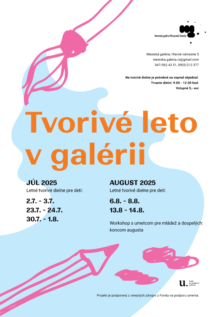 Mestská galéria Rimavská Sobota opäť počas letných prázdnin otvára svoje brány malým aj väčším milovníkom výtvarného umenia. Tvorivé leto v galérii je sériou obľúbených letných výtvarných dielní pre deti, ktoré ponúkajú priestor pre rozvoj fantázie, tvorivosti a zmyslu pre estetiku.