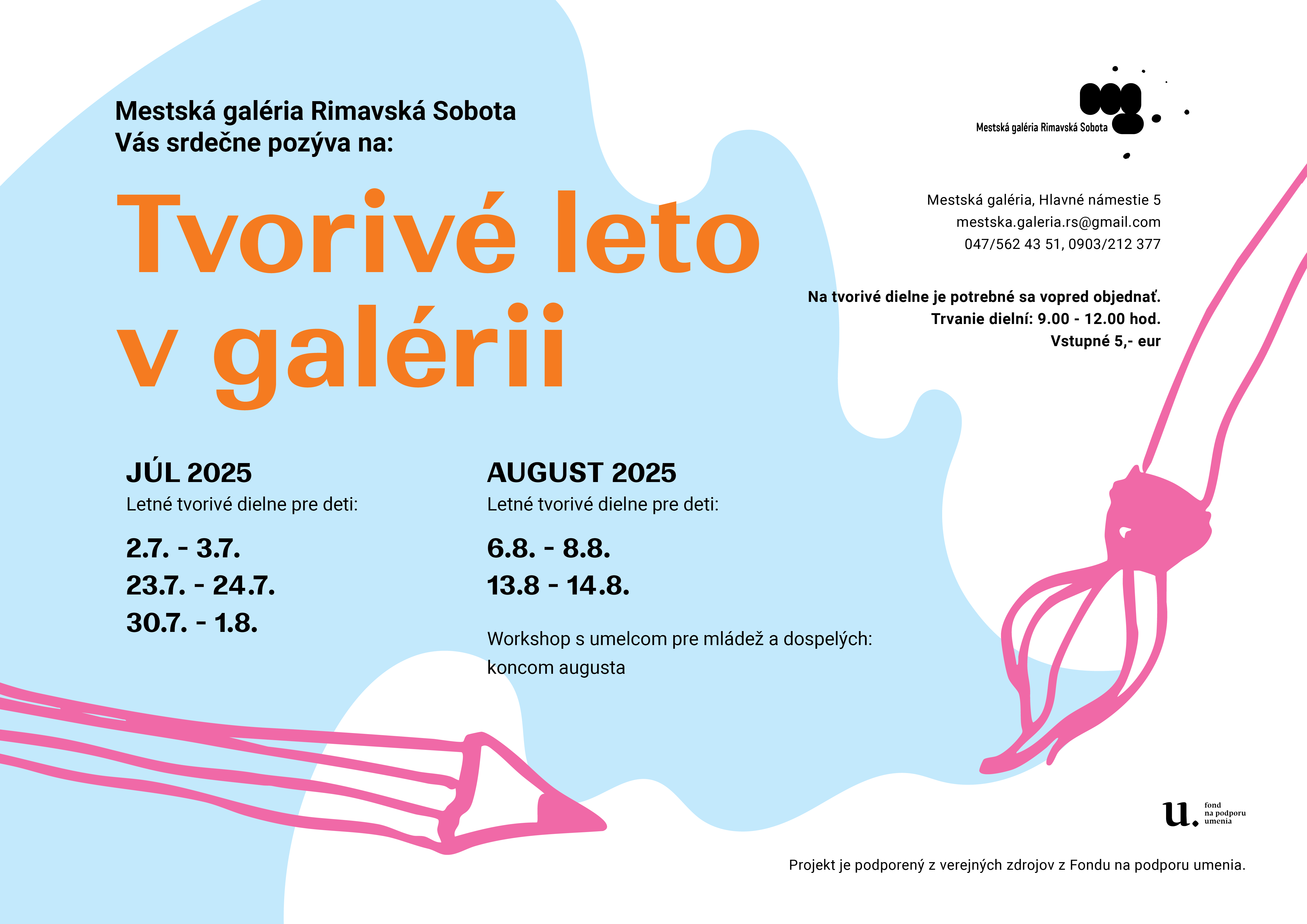 Mestská galéria Rimavská Sobota opäť počas letných prázdnin otvára svoje brány malým aj väčším milovníkom výtvarného umenia. Tvorivé leto v galérii je sériou obľúbených letných výtvarných dielní pre deti, ktoré ponúkajú priestor pre rozvoj fantázie, tvorivosti a zmyslu pre estetiku.