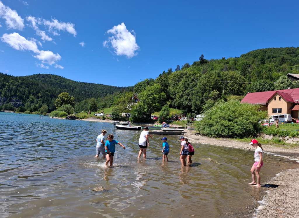 Z Rožňavy pokračovala cesta na Dedinky, kde deti privítalo slnečné a teplé počasie. Pri jazere si užili chvíle oddychu – kŕmili kačky a ryby, ochladili si nohy vo vode a následne si pochutnali na tradičných bryndzových haluškách.