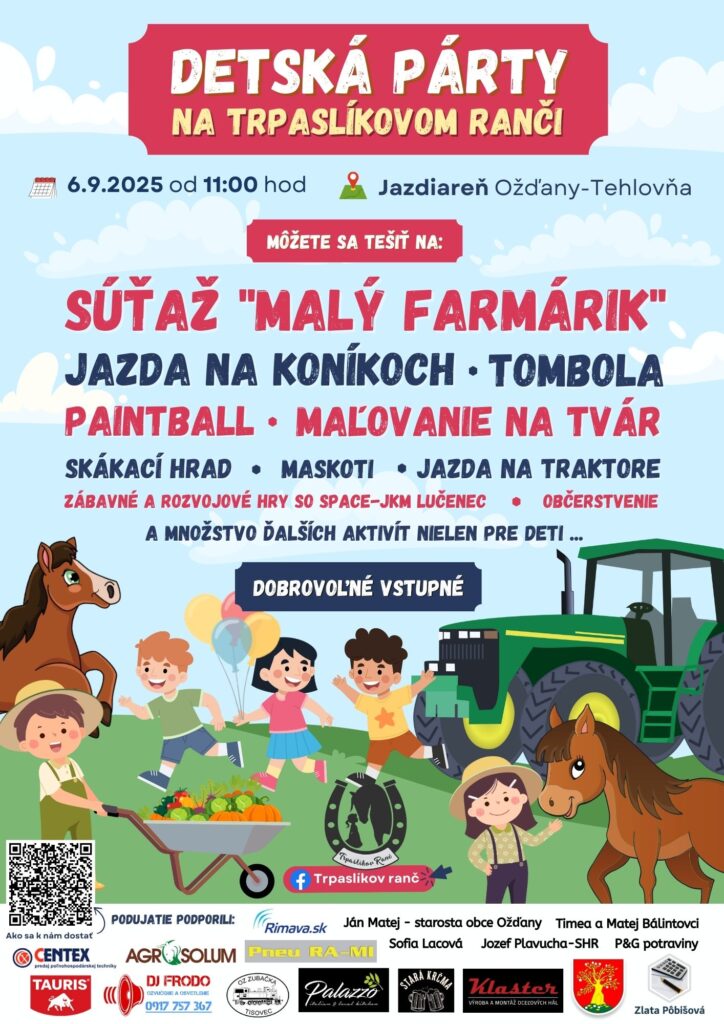 Trpaslíkov ranč v Ožďanoch bude už po štvrtýkrát patriť deťom. Organizátori pripravujú na sobotu, 6. septembra, veselý program, v ktorom si na svoje prídu nielen najmenší, ale aj rodičia. Podujatie sa uskutoční v Jazdiarni Tehlovňa v Ožďanoch a nesie sa v duchu hier, súťaží a nezabudnuteľných zážitkov.