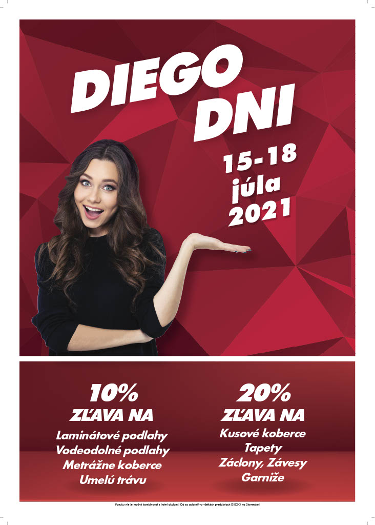 Nepremeškajte zľavy v rimavskosobotskej predajni Diego a zrenovujte či skrášlite svoj domov za menej peňazí. Choďte si v dňoch od 15. do 18. júla po 10-percentnú zľavu na laminátové podlahy, vodeodolné podlahy, metrážne koberce a umelú trávu.