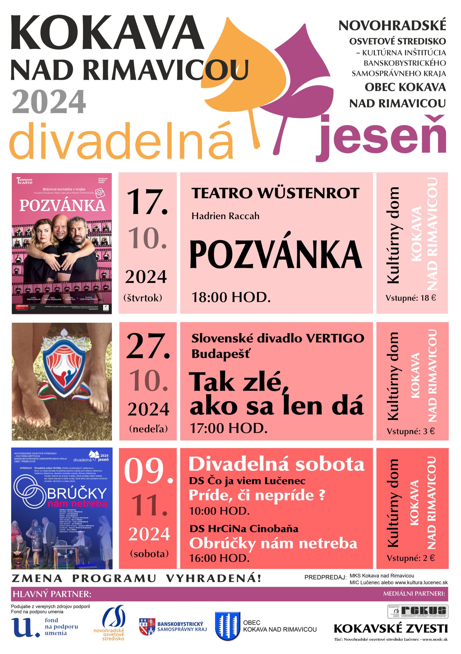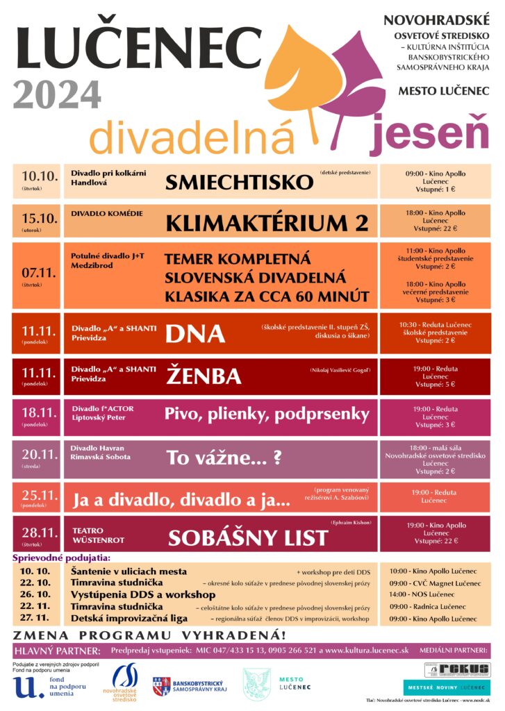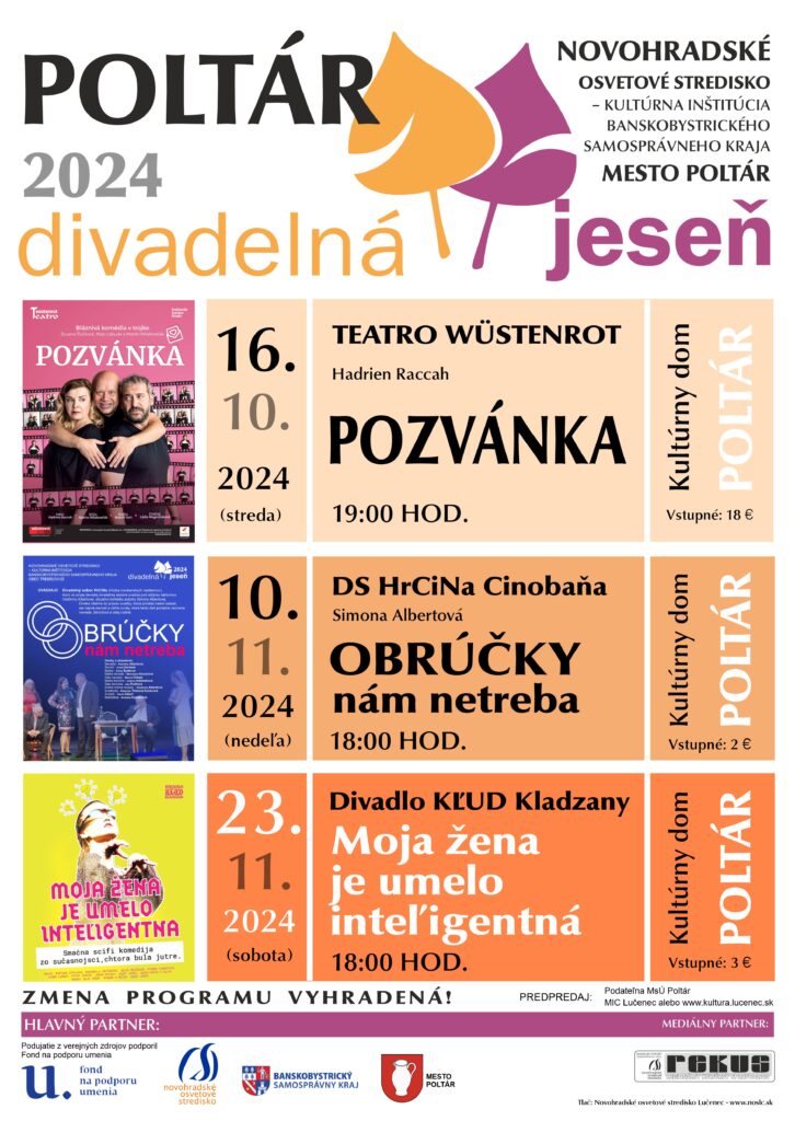 Divadelná jeseň 2024 sa koná s podporou Fondu na podporu umenia a finančnou podporou Banskobystrického samosprávneho kraja. Festival sľubuje bohatý program, ktorý zaujme všetky vekové kategórie a prinesie do regiónu množstvo divadelného umenia a zábavy.