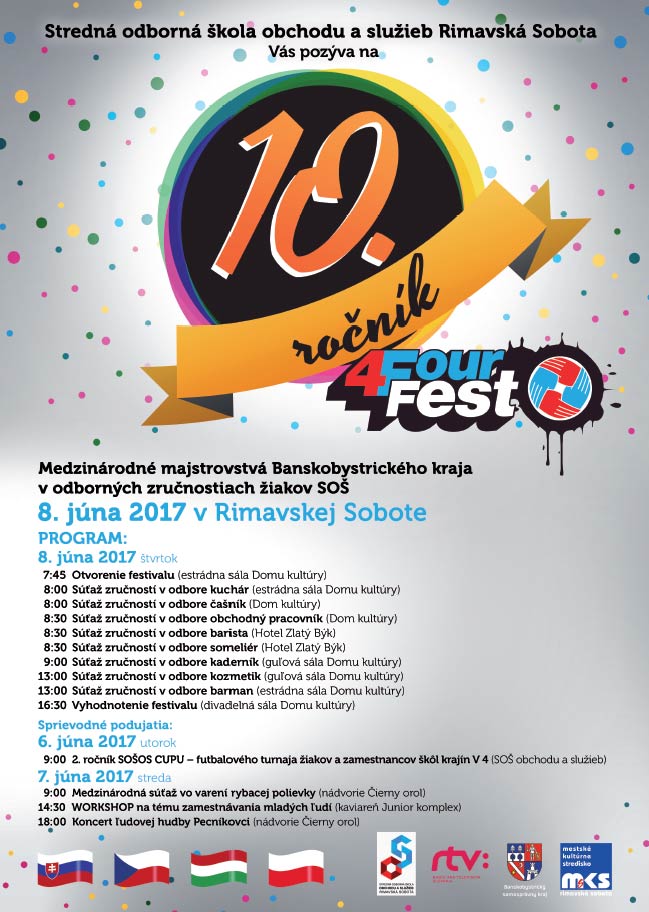 Festival odborných zručností žiakov stredných odborných škôl krajín V4 FOURFEST sa nezadržateľne blíži. Svoj 10. ročník začne písať vo štvrtok, 8. júna. Ako ďalej Rimava.sk informoval Jaroslav Bagačka, riaditeľ Strednej odbornej školy obchodu a služieb (SOŠOS) v Rimavskej Sobote, ktorá toto podujatie organizuje, tento rok to bude aj o rekorde.Podľa jeho slov sa o to postará rekordný počet súťažiacich, ktorý prekročil hranicu 100. A tí ukážu svoje zručnosti a schopnosti v kategóriách kuchár, čašník, kaderník, kozmetik, barman, barista, someliér, obchodný pracovník. Teda v kategóriách, ktoré kopírujú učebné a študijné odbory rimavskosobotskej SOŠOS. A s čím sa budú musieť súťažiaci popasovať?