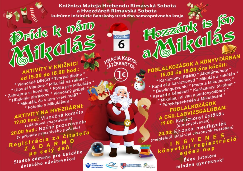 RIMAVSKÁ SOBOTA – Na Hlavné námestie v Rimavskej Sobote zavíta Mikuláš 5. decembra. Ale vedeli ste, že na druhý deň, 6. decembra, sa vráti do Knižnice Mateja Hrebendu? Na všetky deti bude netrpezlivo čakať a odovzdá im sladkú odmenu.