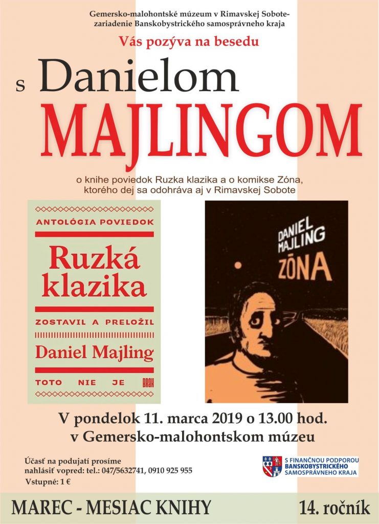 Do Rimavskej Soboty zavíta rodák z Revúcej, známy dramaturg v Slovenskom národnom divadle Daniel Majling. V pondelok, 11. marca o 13:00 hod. v priestoroch Gemersko-malohontského múzea porozpráva o svojej antológii poviedok Ruzká klazika a o knižne vydanom komixe Zóna. Vstupné na besedu je 1 euro. Ak sa na besedu chystáte vo väčšej skupine, tak sa v múzeu nahláste vopred.