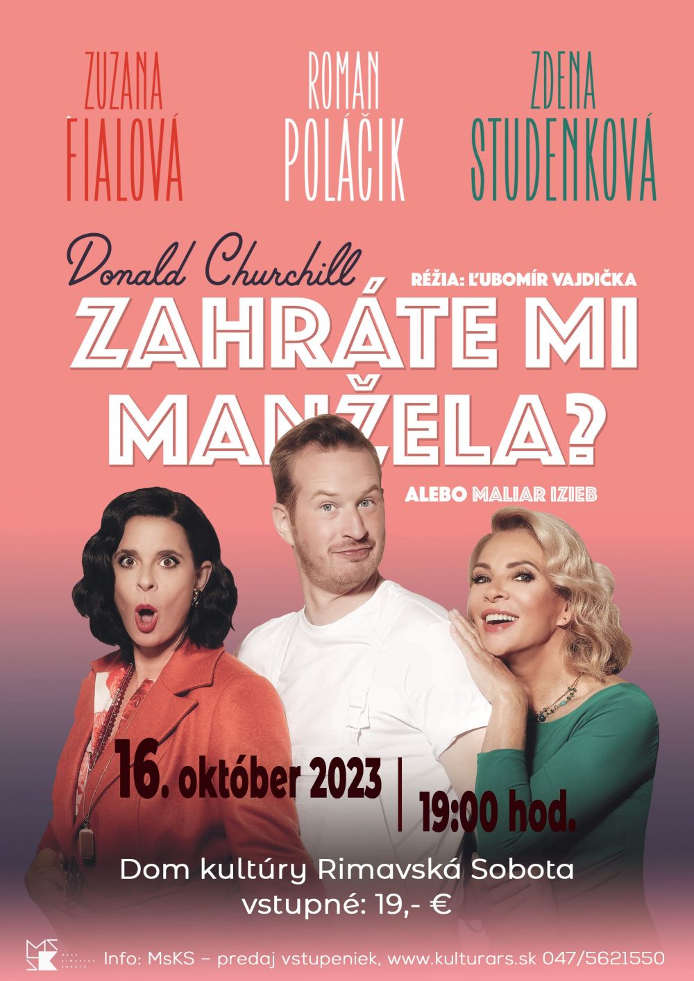 Komédia má jasný cieľ – pobaviť a rozosmiať publikum. Príbeh klasického ľúbostného trojuholníka rozohrajú v pondelok (16. októbra) o 19-tej v divadelnej sále Domu kultúry výnimočné osobnosti: Zdenka Studenková, Zuzana Fialová a Roman Poláčik. Vstupné na podujatie je 19 eur a predaj vstupeniek prebieha v Dome kultúry (vchod od tržnice) alebo online na www.kulturars.sk.