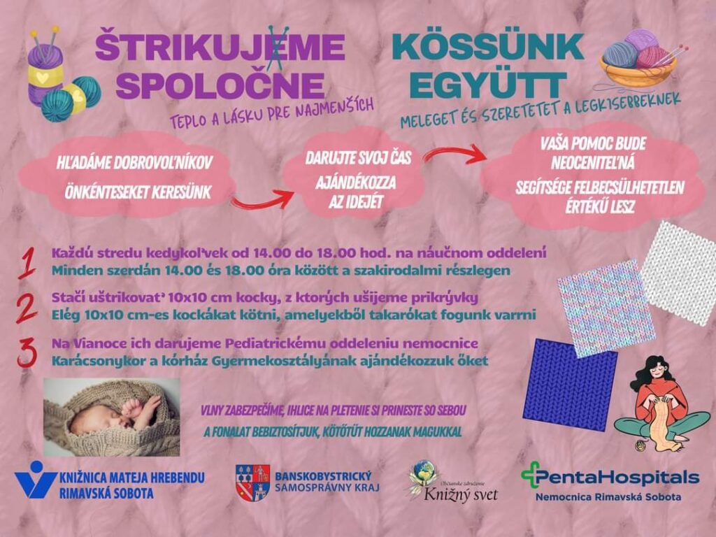 RIMAVSKÁ SOBOTA - Knižnica Mateja Hrebendu v Rimavskej Sobote v spolupráci s Banskobystrickým samosprávnym krajom a nemocnicou Penta Hospitals organizuje charitatívnu iniciatívu pod názvom "Štrikujeme spoločne – teplo a lásku pre najmenších", ktorej cieľom je vytvoriť teplé prikrývky pre deti hospitalizované na pediatrickom oddelení.