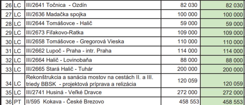Kraj bude ďalej opravovať úsek cesty Lupoč – Praha – intravilán Praha (114-tisíc eur). Ďalej sa na zozname investícií nachádza úsek cesty Tomášovce – Gregorová Vieska, kde BBSK do opravy investuje 110-tisíc eur.