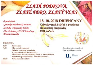 Súťaž začína počas obidvoch dní o 9:00 hod. slávnostným otvorením a kultúrnym programom, kde sa v prvý deň predstavia žiaci Základnej umeleckej školy z Rimavskej Soboty. Druhý deň ich vystrieda detská ľudová hudba a speváci detského folklórneho súboru Hájik z Rimavskej Soboty. Po ukončení celoslovenskej súťaže je pre účastníkov pripravená aj beseda so známou spisovateľkou Gabrielou Futovou. Počas obidvoch dní je pre účastníkov zabezpečený bohatý sprievodný program (výstava s rozprávkovou tematikou, prezentácie obce a Pamätnej fary P. E. Dobšinského, rozprávkové postavičky Maťko a Kubko, prezentácia súťaže z minulých ročníkov). Počas obidvoch dní bude hosťom súťaže aj známy spisovateľ Peter Glocko. Súčasťou podujatia je aj divadelné predstavenie ŽOBRÁCI, ktoré sa uskutoční 17. 10. 2018 o 19:00 hod. v rekreačnom stredisku DRIEŇOK na Teplom Vrchu.
