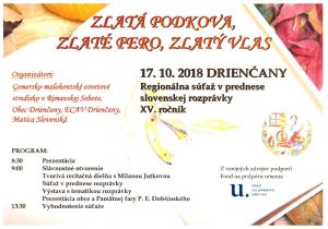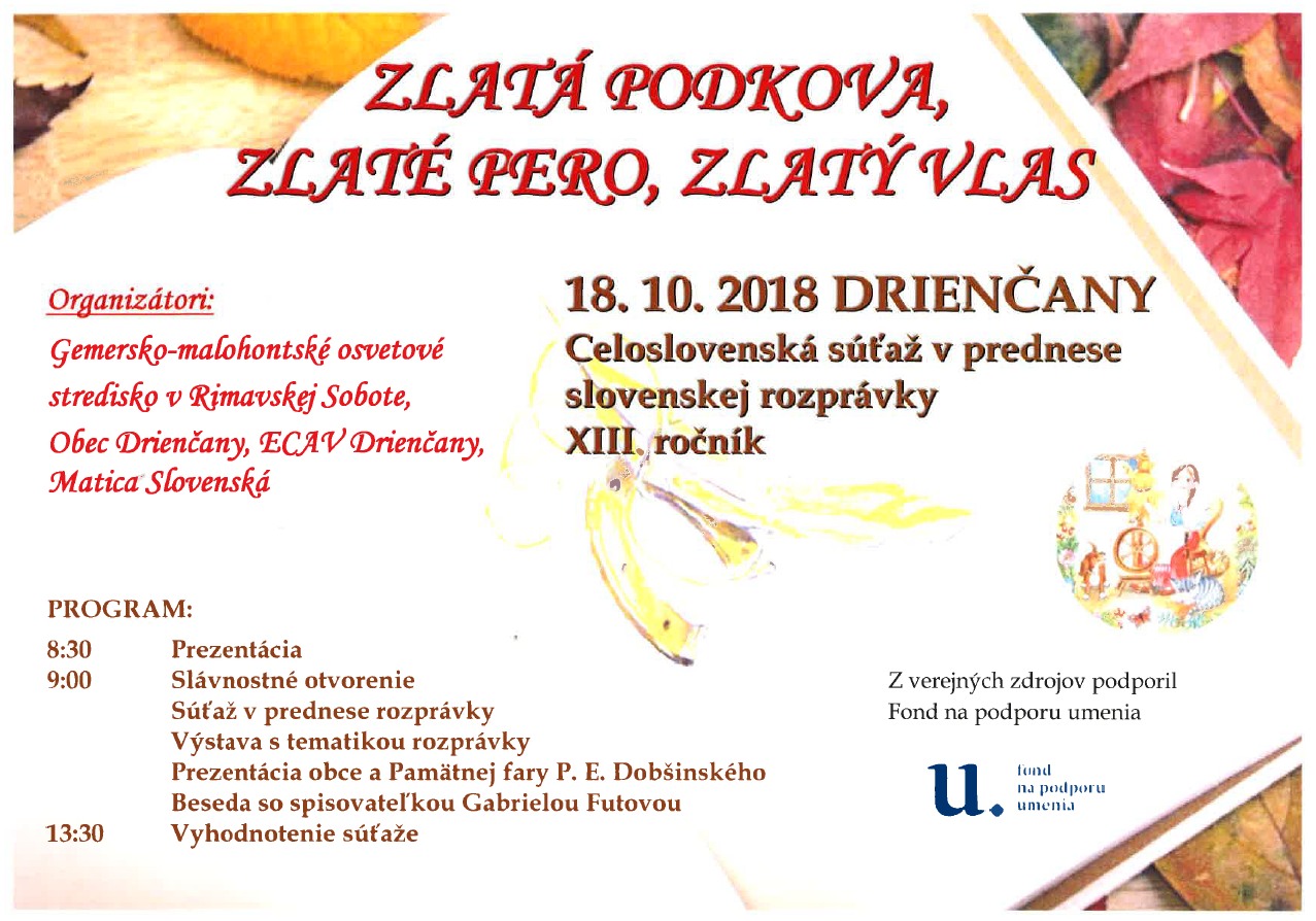 Gemersko-malohontské osvetové stredisko v Rimavskej Sobote organizuje v spolupráci s obcou Drienčany, ECAV Drienčany a Maticou slovenskou v poradí už 15. ročník regionálnej a 13. ročník celoslovenskej súťaže v prednese slovenskej rozprávky pod názvom Zlatá podkova, zlaté pero, zlatý vlas. Podujatie sa uskutoční 17. – 18. októbra v Drienčanoch a koná sa na počesť Pavla Emanuela Dobšinského.