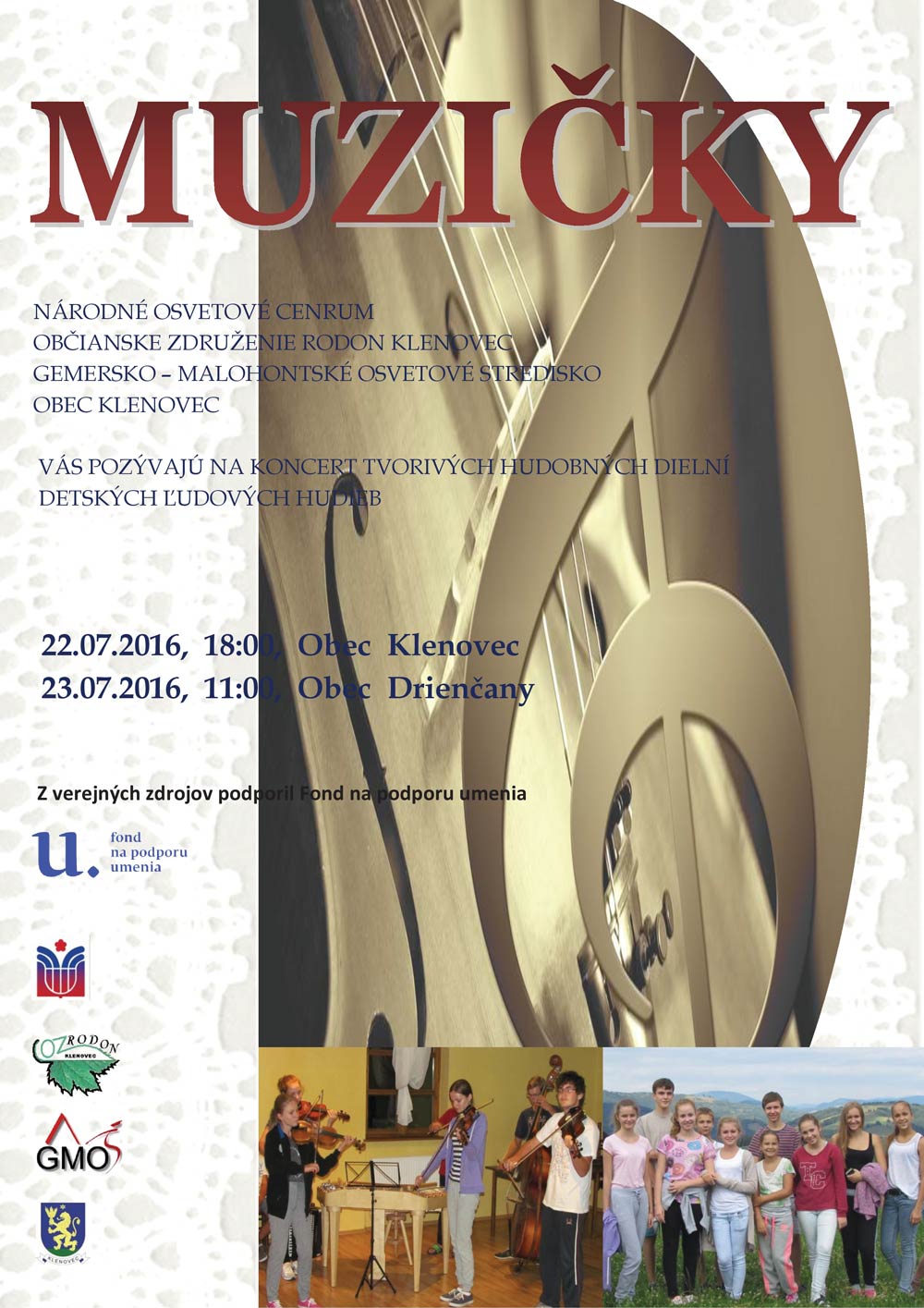 Tvorivé dielne Muzičky, ktoré sú zamerané na detské ľudové hudby, organizujú v Klenovci už po 14-ty krát. Cieľom projektu je podľa Zvarovej vzdelávanie členov detských ľudových hudieb v zachovávaní hudobných nárečí regiónov a v interpretačných zručnostiach. O ich odborný rast sa starajú muzikanti a lektori Michal Zelinka, Zuzana Holiková a Milan Veróny. „V rámci voľnočasových aktivít spoznávajú prírodné a kultúrne dedičstvo nášho regiónu a vďaka lektorom remesla aj remeselné techniky," povedala Zvarová. Projekty realizujú občianske združenie RODON Klenovec, Národné osvetové centrum, a Gemersko – malohontské osvetové stredisko v Rimavskej Sobota v spolupráci s obcou Klenovec.