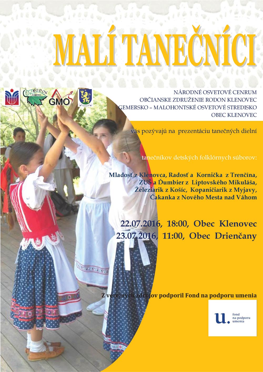 V rámci celodenného programu v Drienčanoch už túto sobotu vystúpia aj mladí nadaní tanečníci a hudobníci z tvorivých dielní Malí muzikanti a Muzičky, ktoré sa v priebehu tohto týždňa konajú v Klenovci. Ako Rimava.sk informovala Stanislava Zvarová z Gemersko-malohontského osvetového strediska v Rimavskej Sobote tanečné tvorivé dielne Malí muzikanti prilákali dvadsať nadaných tanečníkov od 10 rokov, ktorí sa zdokonaľujú v ľudovom tanci. Deti z folklórnych súborov sa v priebehu učia tance z regiónu Myjava a Horný Liptov s odbornou pomocou tanečných pedagógov a choreografov Agáty Krausovej, Slavomíra Ondejku, Lenky Konečnej a Pavla Konečného.