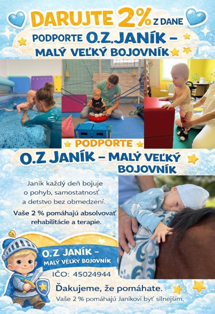 Do redakcie Rimava.sk sa v posledných dňoch obrátilo viacero organizácií a rodín z regiónu s prosbou o podporu. OZ Janík – Malý veľký bojovník hovorí jednoducho: každý bojovník potrebuje svoj tím. Dve percentá pre nich znamenajú konkrétnu pomoc a šancu nevzdať sa.