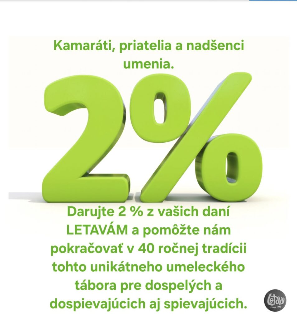 Darujte 2 % z vašich daní LETAVÁM a pomôžte nám pokračovať v 40 ročnej tradícii tohto unikátneho umeleckého tábora pre dospelých a dospievajúcich aj spievajúcich.