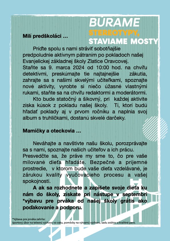 Ak aj vy máte chuť objaviť miesto, kde vzdelanie ožíva v každom detaile, príďte na Dni otvorených dverí do Evanjelickej základnej školy Z. Oravcovej.