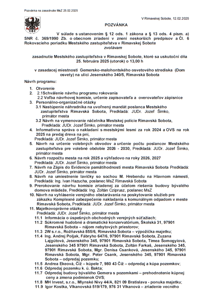 Na programe rokovania budú viaceré dôležité body, ktoré ovplyvnia fungovanie mesta. Poslanci sa budú zaoberať personálnymi otázkami, vrátane návrhu na vymenovanie nového náčelníka Mestskej polície Rimavská Sobota a nastúpením náhradníka na voľný poslanecký mandát.