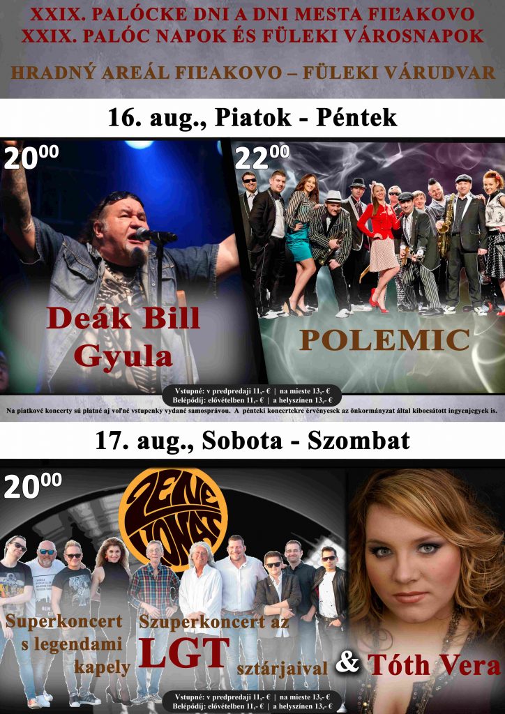 V rámci večerných koncertov vystúpia legendárny hudobníci kapely LGT (Zenevonat Superkoncert) s ktorými sa na javisku predstaví speváčka Tóth Vera. Vstupenky budú predávané na mieste, predpredajové vstupenky sú dostupné v MsKS alebo online na stránke www.kultura.filakovo.sk.