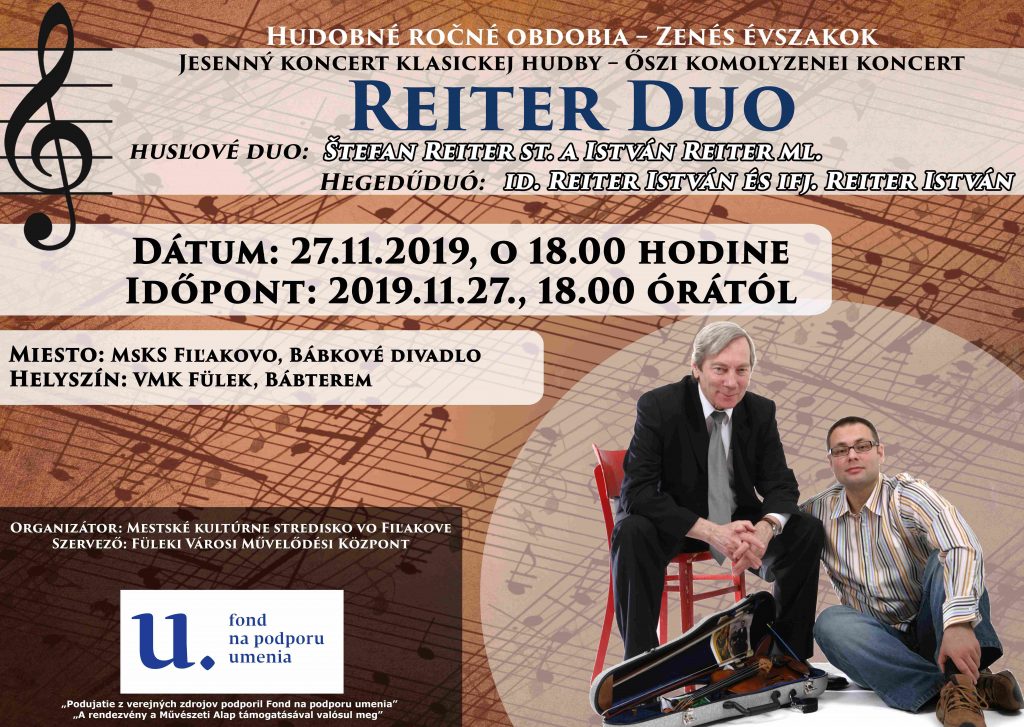 Sériu koncertov pod názvom Hudobné ročné obdobia, organizovanej Mestským kultúrnym strediskom vo Fiľakove, ukončí Reiter Duo. V rámci jesenného koncertu klasickej hudby účinkuje Štefan Reiter st. a István Reiter ml., ktorí 27. novembra so začiatkom o 18:00 hod. vo Fiľakove v priestoroch kultúrneho strediska svojou hrou spríjemnia podvečer návštevníkov. Rimava.sk o tom informovala Andrea Illés Kósik, riaditeľka MsKS vo Fiľakove.