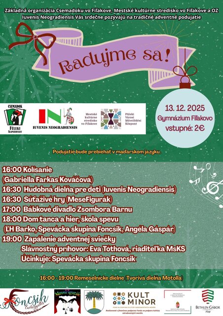 Program bude pokračovať aj v nasledujúci deň, v sobotu 13. decembra 2025, kedy sa o 16:00 hodine v budove miestneho gymnázia uskutoční podujatie s názvom "Radujme sa!". Tento predvianočný program s folklórnym nádychom, vedený v maďarskom jazyku, je určený najmä pre rodiny s deťmi. Návštevníci sa môžu tešiť na školu spevu a tanca, bábkové divadlo, program pre batoľatá či tvorivé remeselnícke dielne. Večer vyvrcholí o 19:00 hodine slávnostným zapálením adventnej sviečky pred budovou gymnázia. Na toto podujatie je stanovené symbolické vstupné 2 eurá.