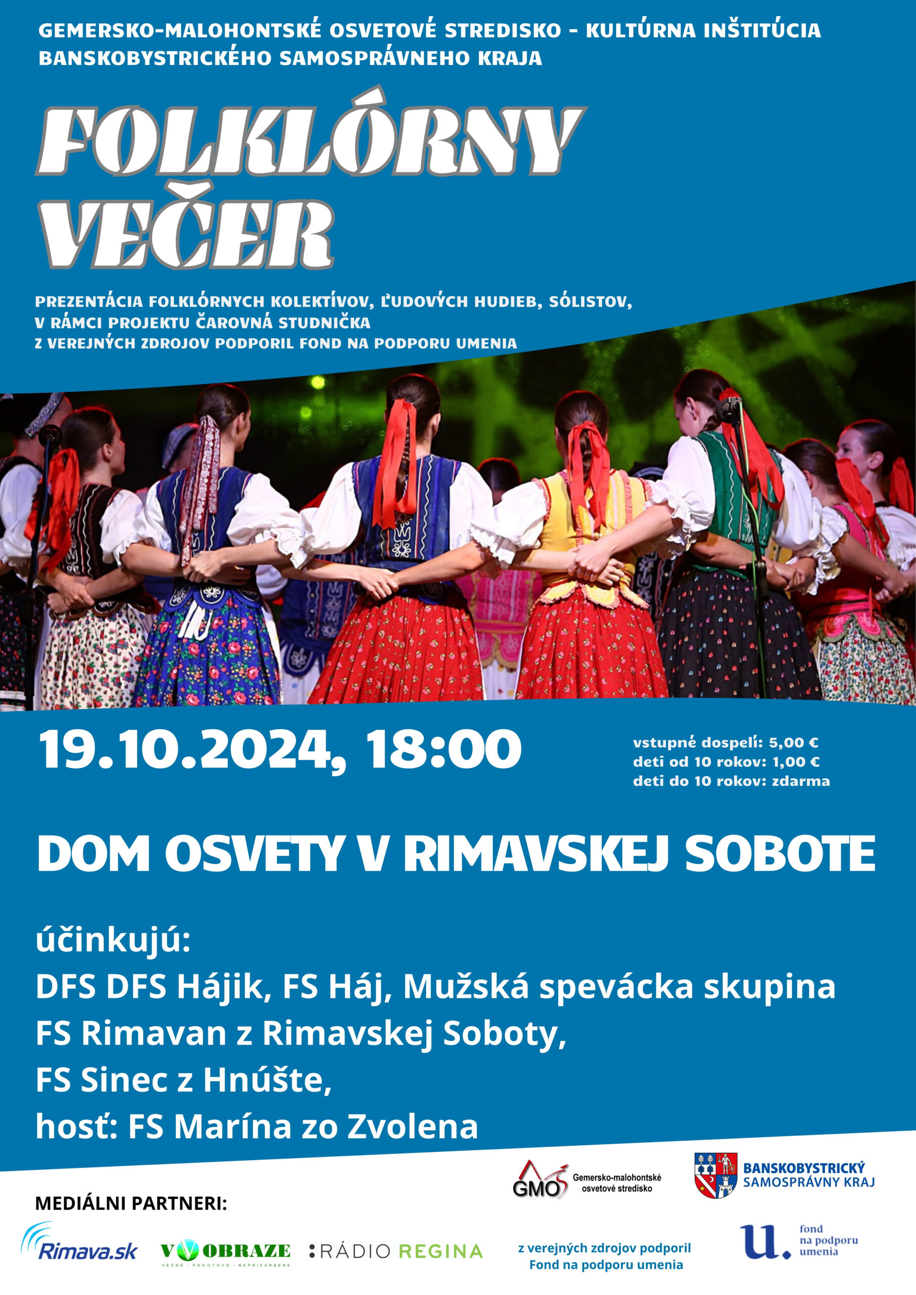 RIMAVSKÁ SOBOTA - Gemersko-malohontské osvetové stredisko (GMOS), kultúrna inštitúcia Banskobystrického samosprávneho kraja, pozýva všetkých milovníkov ľudovej kultúry a folklóru na Folklórny večer, ktorý sa uskutoční v sobotu 19. októbra v Dome osvety v Rimavskej Sobote. Podujatie začne o 18.00 a ponúkne bohatý program plný tradičnej hudby, spevu a tanca.