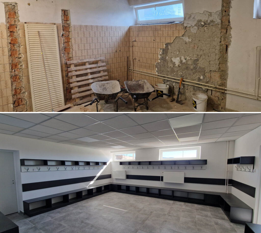 „Šatne neboli v zlom stave ani doteraz. Problém však bol, že veľkostne nespĺňali štandardy SFZ na novú III. ligu, preto sme museli vybúrať priečky a vytvoriť miestnosť o veľkosti 25 m2 s 20 sedacími miestami. Tiež toalety mali hostia a domáci spoločné na chodbe, čo bolo nevyhovujúce. Vybudovali sme preto nové sociálne zázemie priamo pri šatni s presným počtom hygienických zariadení a spŕch podľa požiadaviek SFZ,“ ozrejmil Visnyiai.