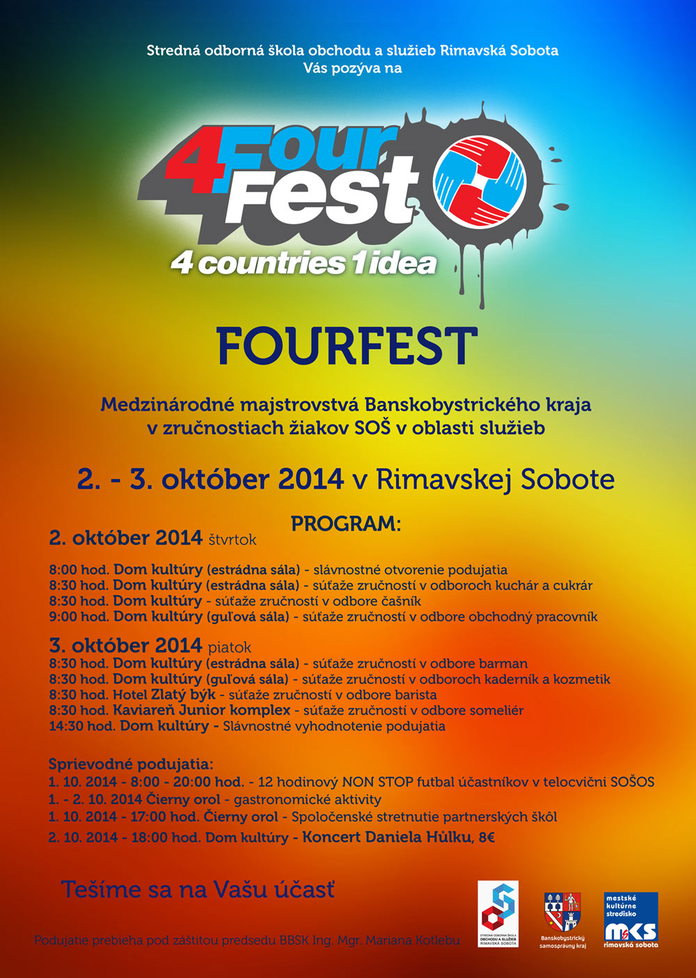 V nezvyčajnom termíne, no s tradične zaujímavým a lákavým programom chystá Stredná odborná škola obchodu a služieb v Rimavskej Sobote tohtoročný Four Fest, súťaž v šikovnosti žiakov. Začiatkom októbra na nej privítajú vyše stovku mladých ľudí, budúcich čašníkov, kuchárov, cukrárov, barmanov, baristov, someliérov, kaderníkov, kozmetičky aj obchodných pracovníkov. Konkurencia pri plnení súťažných úloh bude nepochybne veľká, svoju účasť opäť potvrdili školy z piatich krajín. Pripravené sú však aj sprievodné podujatia, originálne športové zápolenie či vystúpenie známej českej muzikálovej hviezdy.