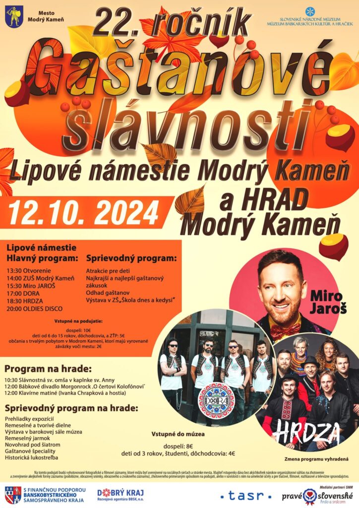 MODRÝ KAMEŇ - Čaká nás 22. ročník Gaštanových slávností. Modrý Kameň pri Veľkom Krtíši tak bude počas druhej októbrovej soboty (12. 10.) žiť tradičným podujatím, ktoré do mesta opäť priláka kopec návštevníkov.