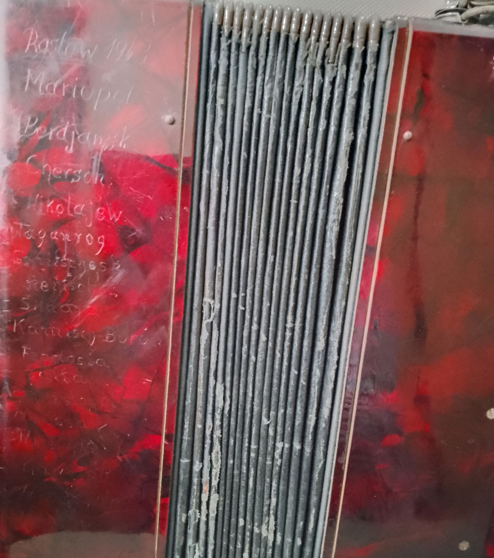 Hudobný nástroj nie je len zaujímavým exponátom, ale aj tichým svedkom vojenských ťažení a osudov, ktoré sa počas vojny preplietali naprieč Európou. Na jeho zadnej strane je vyrytých 20 názvov lokalít, ktorými prechádzal jeho majiteľ. Prvým zaznamenaným miestom je Rostov na Done, pričom datovanie 1943 odkazuje na obdobie, keď mesto opustila nemecká armáda po jeho oslobodení Červenou armádou.