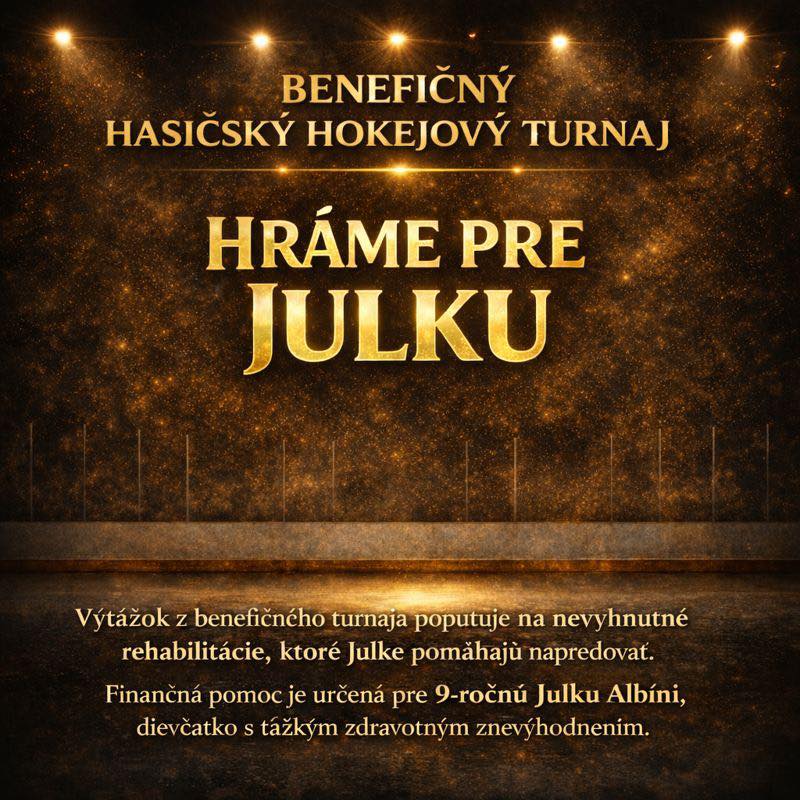 Na netradičnom benefičnom hokejovom turnaji sa 18. februára 2026 stretnú hasiči z celého regiónu, aby pomohli deväťročnej Julke s ťažkým zdravotným postihnutím. Ich cieľom je vyzbierať financie na nevyhnutné rehabilitácie.