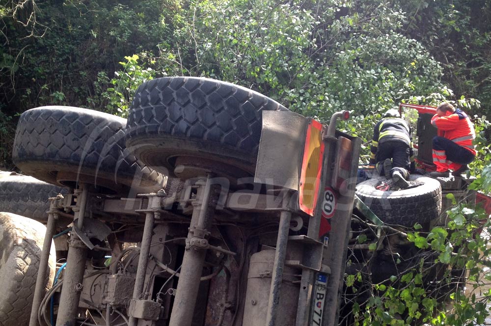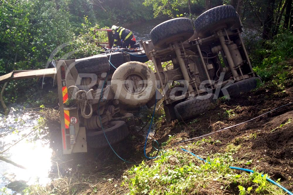 Hasiči zachraňovali prevráteného kamionistu, hrozilo, že sa utopí