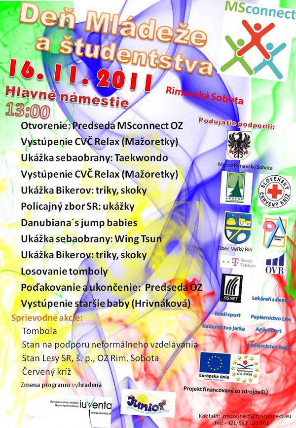 Podľa jeho slov sa podujatie uskutoční pod záštitou občianskeho združenia MSconnect. Štyria mladí ľudia, okrem Daniela aj Martin Antal, Marek Astaloš a Jozef Gembický, sa zúčastňovali školení KomPrax, kde hovorili o tom, čo mládeži v jednotlivých regiónoch chýba. Záverečnou skúškou získali všetci po dvesto eur, práve z tých peňazí a vďaka sponzorom je zajtrajšie podujatie financované. Ako 16-ročný študent ďalej uviedol, v Rimavskej Sobote a okolí považujú za najvážnejší problém vysokú nezamestnanosť. „Podľa mňa aj to je jeden z dôvodov, prečo mladí ľudia majú na svedomí trestné činy, ktorých je čoraz viac. Chceme ukázať, že existuje veľa možností ako tráviť svoj voľný čas, ako využiť svoju energiu na niečo zmysluplné,“ povedal Daniel.