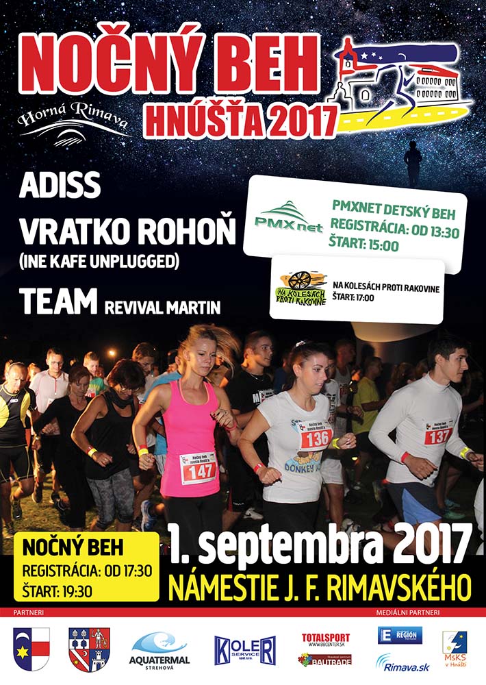 V piatok, 1. septembra 2017, sa v Hnúšti uskutoční už 4. ročník podujatia Nočný beh Hnúšťa 2017, ktoré organizuje občianske združenie Horná Rimava. „V minulom roku sme v spolupráci so spoločnosťou PMXnet organizovali aj beh pre deti, ktorý bol veľmi úspešný, behať prišlo približne 250 detí, takže v ňom budeme pokračovať aj tento rok,“ informoval hlavný organizátor podujatia Roman Lebeda z občianskeho združenia Horná Rimava. Ako ďalej spomenul, štartovné na detské preteky je pre všetky deti zdarma. „Deti sa môžu tešiť na občerstvenie, cukrovú vatu, hotdogy a na víťazov čakajú hodnotné vecné ceny,“ avizuje.