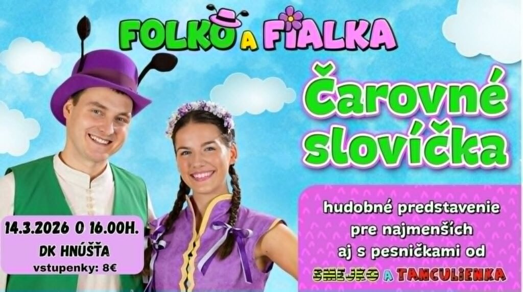 Miestny Dom kultúry sa v sobotu 14. marca 2026 o 16:00 hod. premení na svet plný hudby a tanca. Hlavnými hrdinami sú mravček Folko, známy svojím tanečným nadaním, a víla Fialka, ktorej spev si podmaní každého detského diváka.