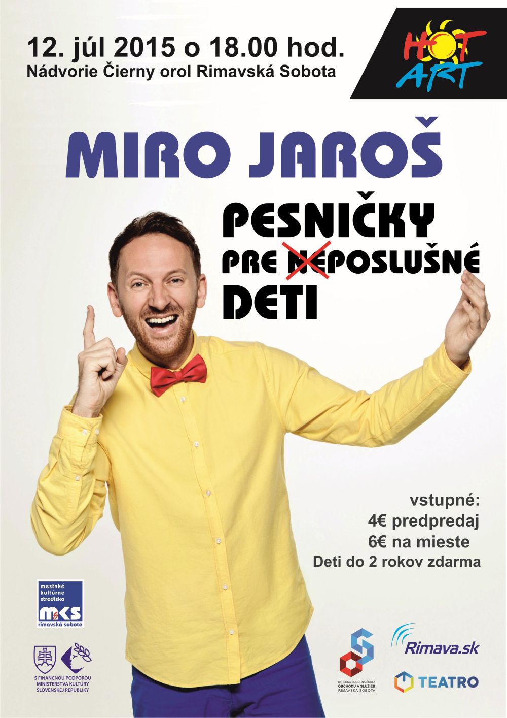Koncert slovenského speváka Mira Jaroša je venovaný najmenším divákom. Ten pricestuje v nedeľu, 12. júla o 18.00 hod. do Čierneho orla, aby prostredníctvom hudby, hravou formou učil deti slušnému správaniu, stolovaniu, prechádzaniu cez cestu a tiež ako sa starať o svoje hračky. V programe plnom motivačných pesničiek pre (ne)poslušné deti, nebudú chýbať Čisté rúčky, Čarovné slovíčka, Pri stole, Veľké upratovanie, Každý má rád zvieratká a iné. Za svoj rovnomenný album získal zlatú platňu.