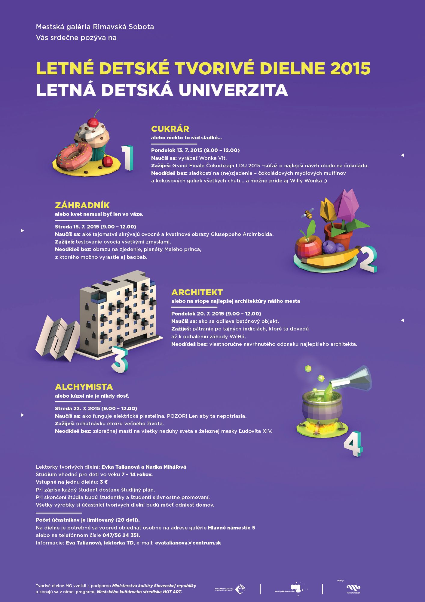 „Aj ďalší program bude venovaný deťom. Mestská galéria pre ne pripravila štyri dopoludňajšie tvorivé dielne pod dohľadom kreatívnych lektoriek Evky Talianovej a Naďky Miháľovej“ priblížila Špitálová ďalší program HOT ART-u. Počas Letnej detskej univerzity, ako sa tvorivé dielne nazývajú, majú deti možnosť študovať v odboroch cukrár, záhradník, architekt a alchymista. Štúdium je vhodné pre deti vo veku 7 až 14 rokov. „Pri zápise dostane každý študijný plán a pri skončení štúdia budú študentky a študenti slávnostne promovaní.“ povedala Špitálová. Všetky výrobky si účastníci tvorivých dielní budú môcť odniesť domov. Vstupné na jednu dielňu je 3 eurá. Počet účastníkov je limitovaný na 20 detí. Na dielne je potrebné sa vopred objednať osobne na adrese galérie Hlavné námestie 5 alebo na telefónnom čísle 047 / 56 24 351.