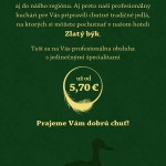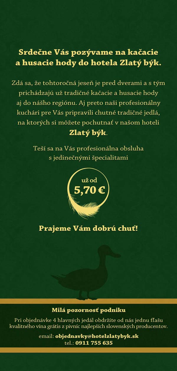 „Pre našich hostí sme pripravili ozajstné hodovanie pri kačacích a husacích špecialitách, ktoré sa tešia veľkej obľube,“ hovorí riaditeľka hotela Zlatý býk. Ako prezradila, ani teraz nezabudli na pozornosť pre hostí, pri objednávke štyroch hlavných jedál dostanú grátis fľašu prvotriedneho vína z pivníc najlepších slovenských producentov.