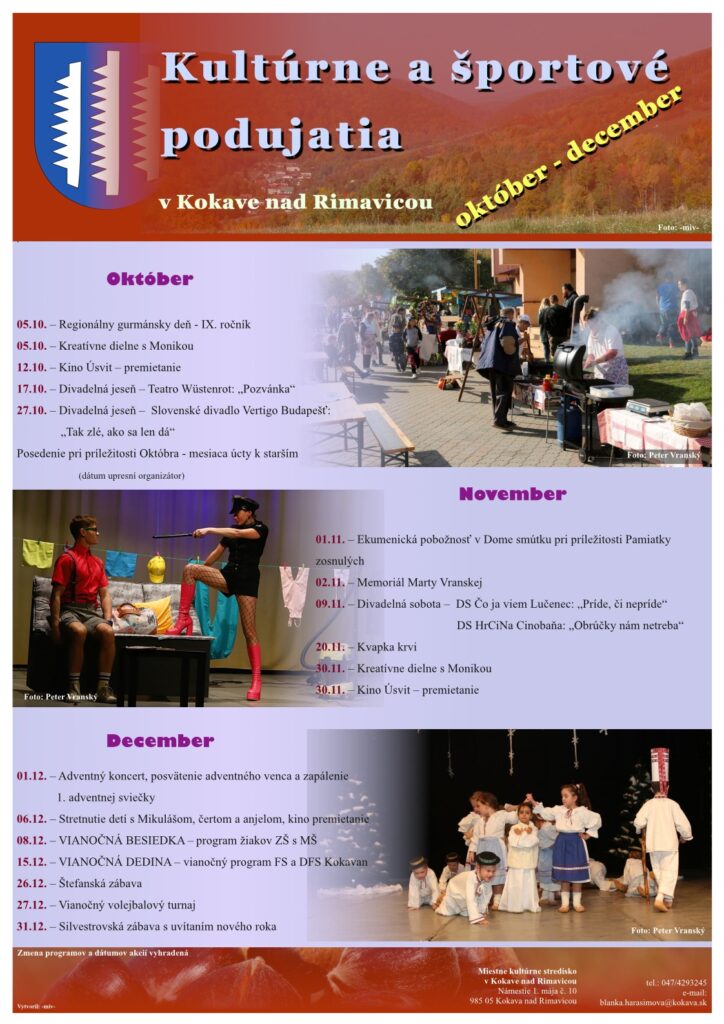 KOKAVA NAD RIMAVICOU - Obec Kokava nad Rimavicou pripravila program kultúrnych a športových podujatí pre obyvateľov a návštevníkov na obdobie od októbra do decembra. Miestne kultúrne stredisko ponúka pestrú škálu podujatí, ktoré sú zamerané na všetky vekové kategórie.