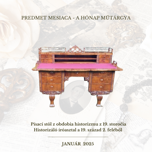 "V rámci prezentačnej aktivity „Predmet mesiaca“ Gemersko-malohontské múzeum v januári 2025 predstavuje verejnosti unikátny reštaurovaný písací stôl s nadstavbou, pochádzajúci z obdobia historizmu, konkrétne z druhej polovice 19. storočia. Tento vzácny kúsok nábytku bude k videniu v priestoroch múzea od 2. do 31. januára 2025. Písací stôl s nadstavbou, ktorý bol dlhé roky skrytý pred očami verejnosti kvôli zhoršenému stavu, je teraz obnovený a prináša návštevníkom pohľad na bohatstvo kultúry a životného štýlu obdobia historizmu. Stôl, vyrobený zo smrekového a bukového masívu, sa vyznačuje symetricky profilovaným plátom, štýlovými nožičkami a bohato vyrezávanými detailmi, ktoré podčiarkujú jeho majestátny vzhľad," informuje Igor Kerepesi, historik Gemersko-malohontského múzea.