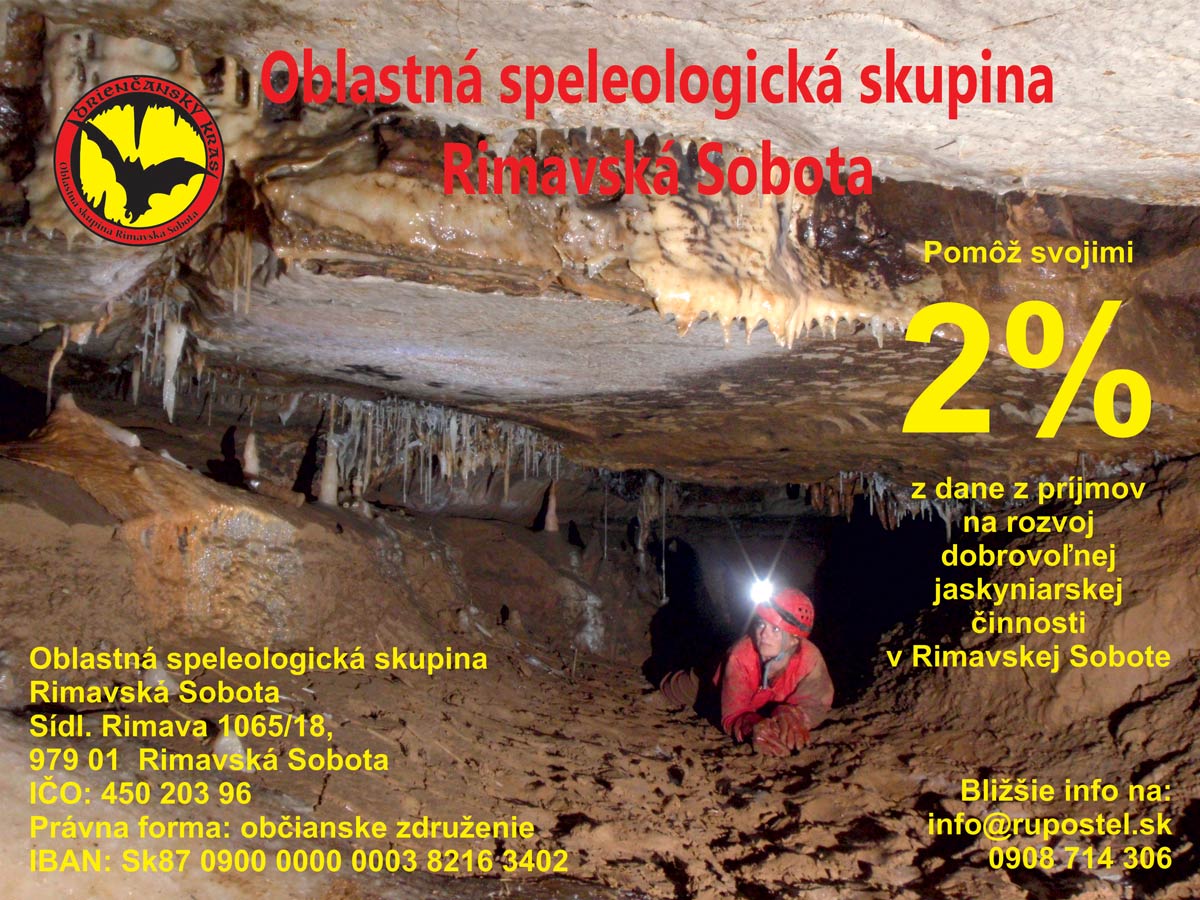 Vedeli ste, že jaskyniarstvo v Rimavskej Sobote má svoju už 40-ročnú históriu? Jeho počiatky siahajú až do roku 1967 a v roku 1970 vznikol Rimavskosobotský amatérsky speleologický klub (RASC). Za ten čas sa miestnym jaskyniarom podarilo prebádať nielen podzemné krásy Drienčanského krasu, ale aj veľkú časť Gemer a Novohradu mimo územia Muránskej planiny a Slovenského krasu. Ako to však v súčasnosti býva, samotné nadšenie a túžba objavovať neobjavené nestačí. Preto sa miestni jaskyniari obracajú aj na Vás, s prosbou o darovanie 2% daní z príjmov. Aj takto sa môžete stať ich podporovateľmi a spolu s nimi ak nie osobne, tak aspoň symbolicky objaviť neprebádané podzemné krásy nielen nášho regiónu.