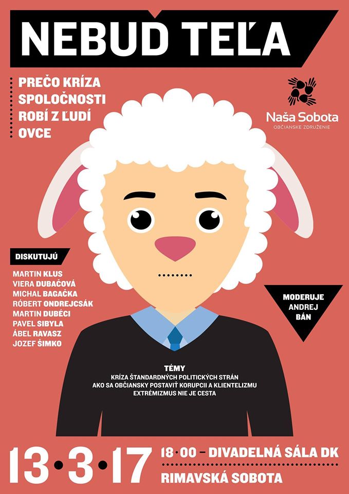 Je v spoločnosti naozaj všetko tak ako má byť? Bez korupcie a klientelizmu? Aj toto budú otázky, ktoré odznejú v rámci diskusie Nebuď teľa - Prečo kríza spoločnosti robí z ľudí ovce, ktorá sa uskutoční v pondelok, 13. marca o 18:00 hod. v divadelnej sále Domu kultúry v Rimavskej Sobote. Vstup na diskusiu je voľný.