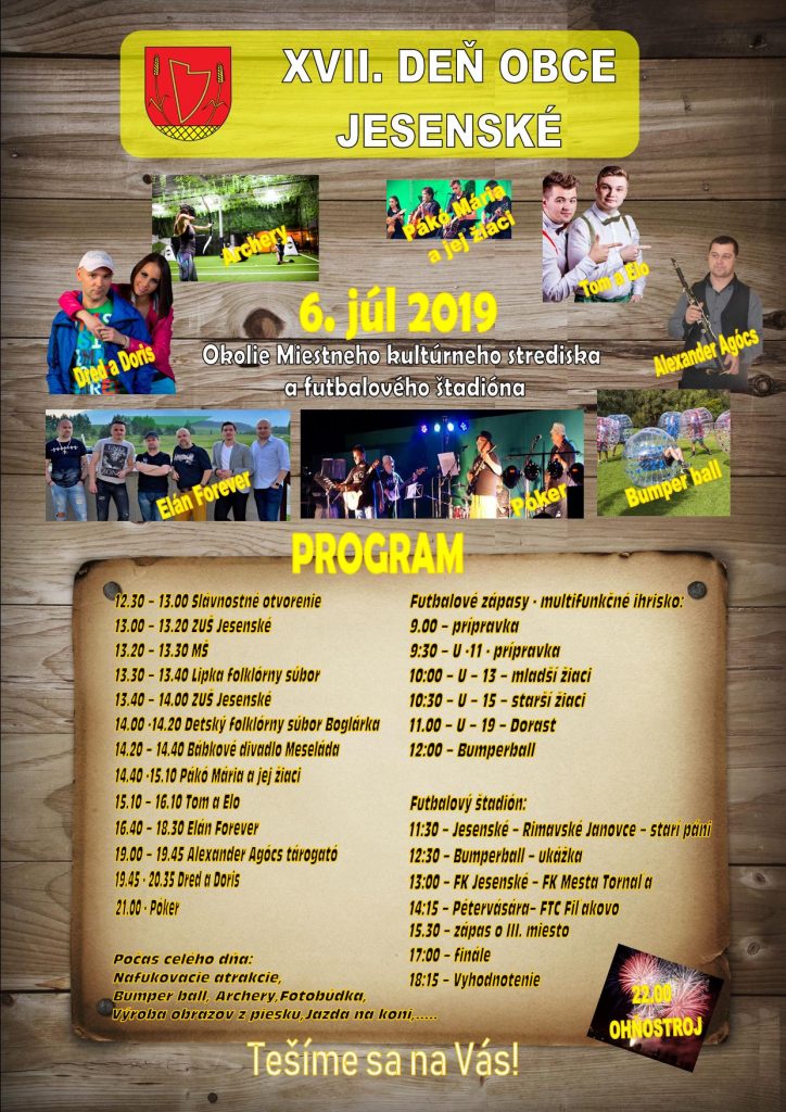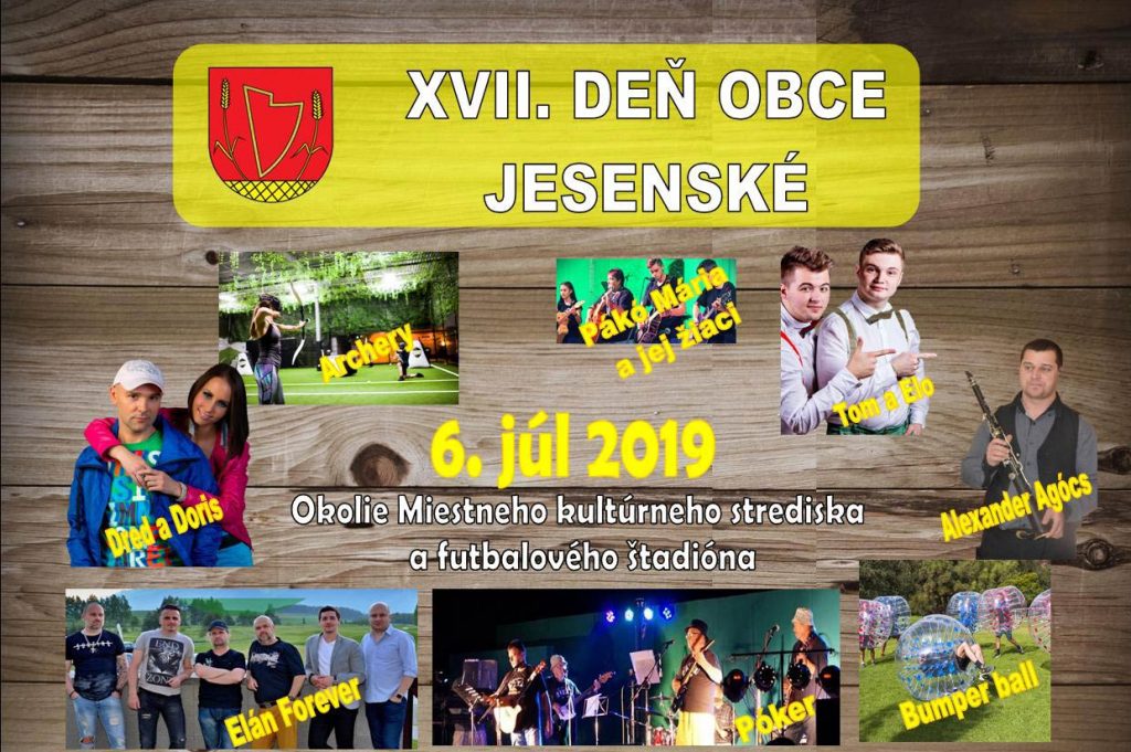 Druhá polovica bohatého programu bude prevažne patriť koncertom. Popoludnie si všetky deti budú môcť zaspievať s dvojicou Tom a Elo, ktorých neskôr vystrieda skupina Elán Forever. Podvečer sa predstaví Alexander Agósc, dvojica Dred a Doris a záver osláv bude patriť skupine Póker. Bodku za 17. ročníkom Dňa obce Jesenské dá o 22:00 hod. ohňostroj.