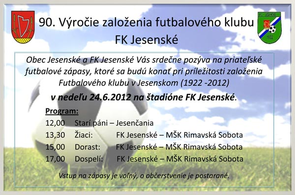 V Jesenskom v okrese Rimavská Sobota už tento víkend niekoľkými priateľskými zápasmi oslávia 90-te výročie založenia futbalového klubu FK Jesenské. V nedeľu, 24. júna, sa na domácom futbalovom štadióne odohrajú priateľské futbalové zápasy všetkých vekových kategórií, súperom budú futbalisti z Rimavskej Soboty.