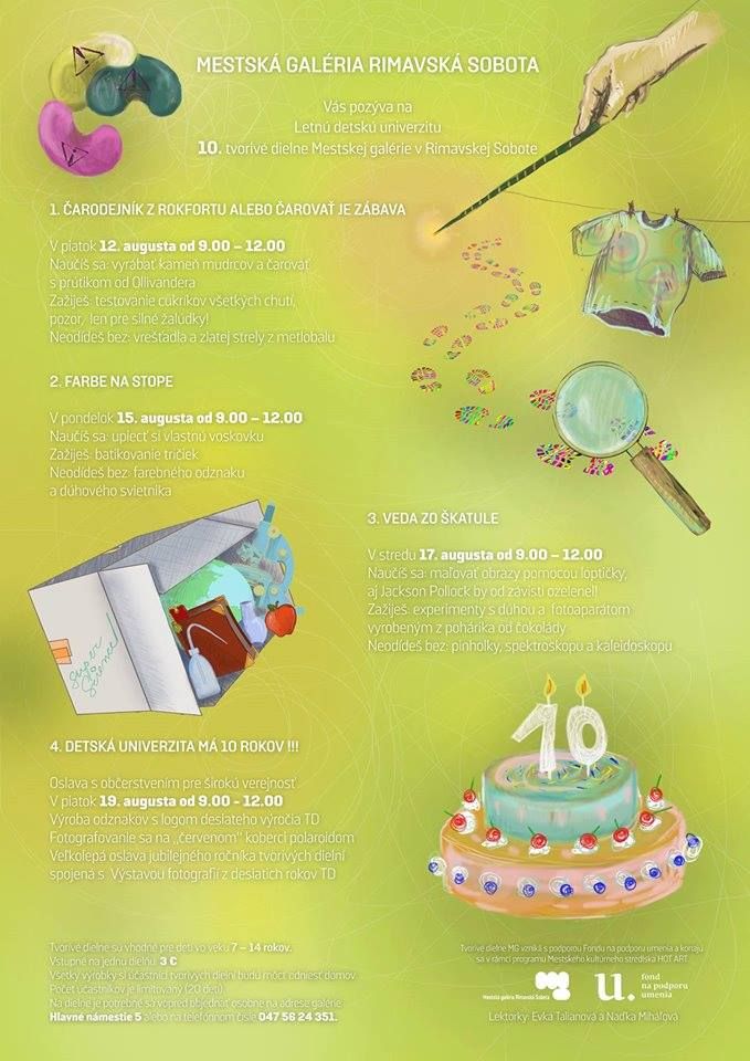 Organizovanie Letnej detskej univerzity sa v Rimavskej Sobote stalo už tradíciou a vždy sa teší veľkej obľube. Aj tentoraz si Mestská galéria pripravila pre vaše deti zaujímavý a kreatívny program. Okrem zmysluplného využitia voľného prázdninového času budú mať tiež možnosť spoznať nových kamarátov, zažijú veľa zábavy a naučia sa niečo nové. Navyše si budú môcť všetky svoje výtvory odniesť so sebou domov.