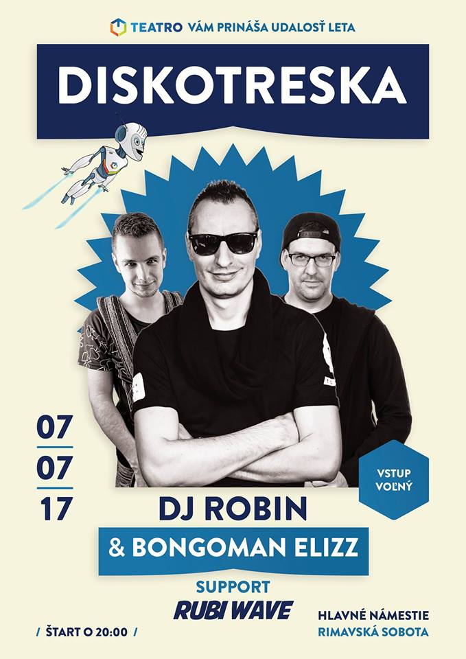 Masívny zvuk, svetelná show a zábava až do rána čaká na všetkých tanca chtivých na Diskotreske na Hlavnom námestí v Rimavskej Sobote, kde to v piatok, 7. júla, roztočia DJ Robin, Bongomann Elizz a Rubi Wave.