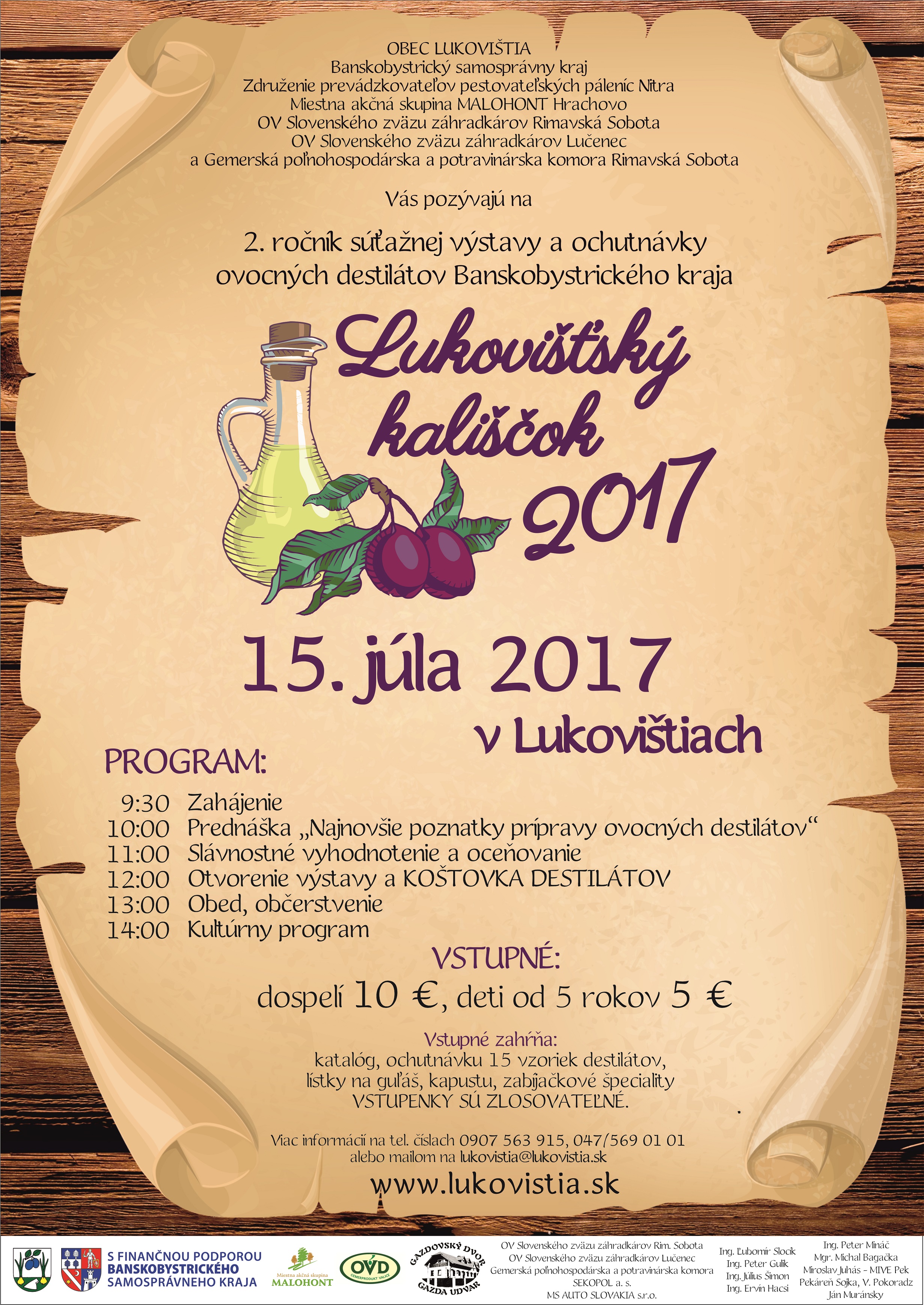 Viac ako 260 vzoriek z 30 páleníc Banskobystrického kraja bude možné ochutnať v rámci súťažnej výstavy a ochutnávky ovocných destilátov Lukovišťský kališčok v sobotu, 15. júla, v Lukovištiach. Doobedu bude vyhodnotenie a ocenenie víťazov, po ktorom bude nasledovať koštovka páleniek a nebude chýbať ani kultúrny program či niečo dobré pod zub. Viac o súťaži sa dočítate v článku: V Lukovištiach vybrali z takmer 300 páleniek tú naj, verejnosť ich môže ochutnať v júli