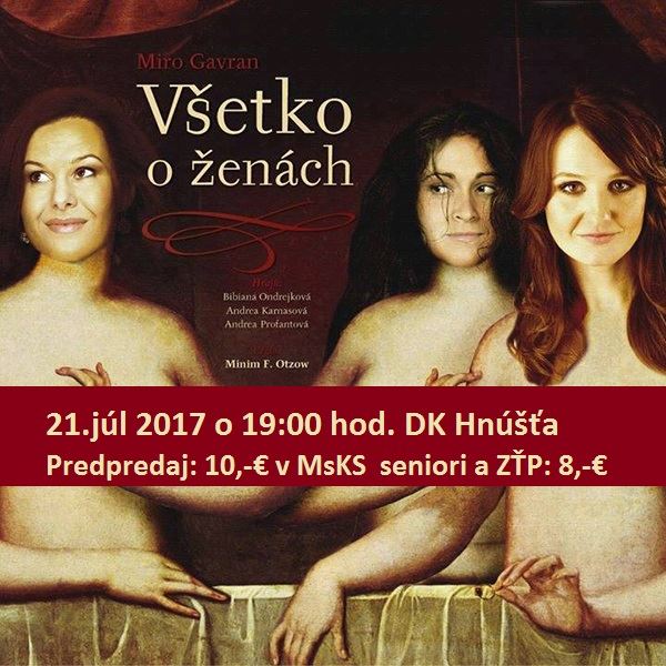 Piatok, 21. júla, bude v Hnúšti patriť divadlu. Skvelý herecký trojkoncert odhalí mužom všetko, čo chceli vedieť o ženách, ale báli sa to opýtať. Divadelná komédia nahliadne v piatich príbehoch do duše ženy, do jej pocitov, do sveta intríg, ľúbostných sklamaní, ale aj šteklivých tajomstiev.