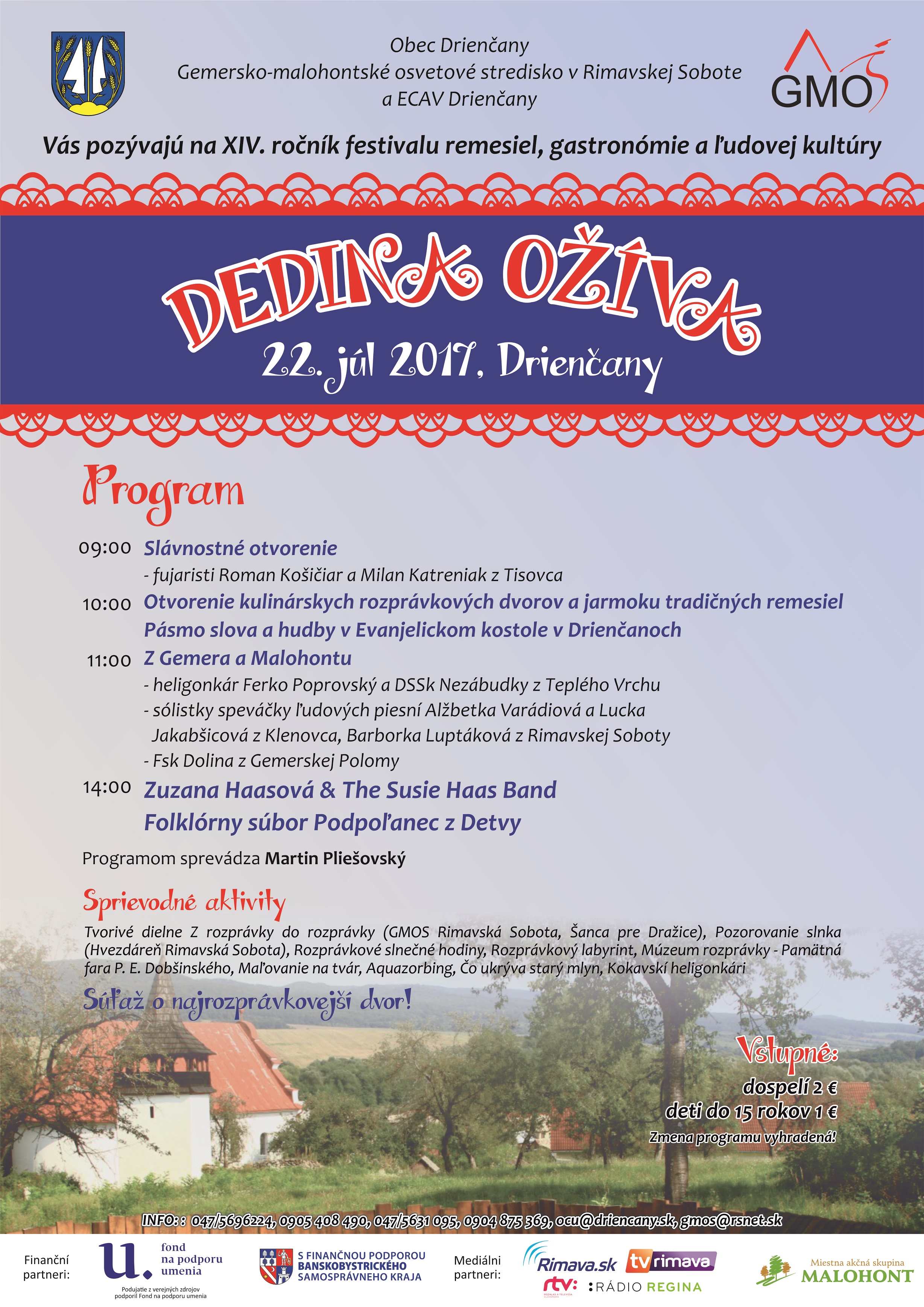 Rozprávkové Drienčany si môžete vychutnať všetkými zmyslami počas festivalu remesiel, gastronómie a ľudovej kultúry pod názvom Dedina ožíva v sobotu, 22. júla. Vaše chuťové poháriky potešia špeciality starých mám i súčasné kulinárske pochúťky, ktoré rozvoňajú celú dedinu vo dvoroch, ktoré otvoria ľudia z obce a jej okolia. Očiam i ušiam ulahodia folklórne zoskupenia a sólisti z Gemer-Malohontu a Folklórny súbor Podpoľanec z Detvy. Spestrením programu bude retro kapela Zuzany Haasovej a množstvo sprievodných aktivít.