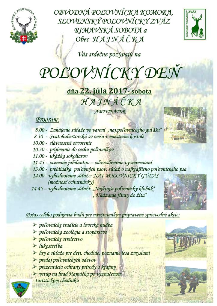 Poľovnícky deň, ktorý sa koná 22. júla v Hajnáčke, ponúkne možnosť bližšie spoznať prácu poľovníkov a pochutnať si na guľáši z diviny. Pripravené sú ukážky práce poľovníkov, prehliadka poľovných psov a mnoho sprievodných akcií ako sokoliarstvo, lukostreľba i hry pre deti.