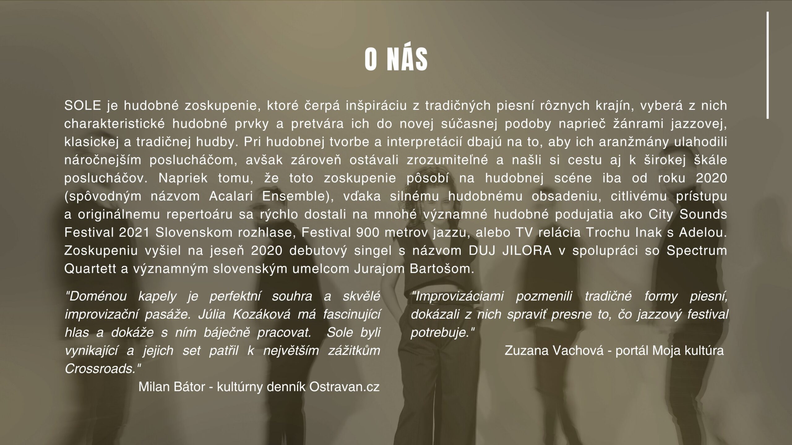 Hudobné zoskupenie Sole čerpá inšpiráciu z tradičných piesní rôznych krajín, vyberá z nich charakteristické hudobné prvky a pretvára ich do novej súčasnej podoby. Prechádza naprieč žánrami jazzovej, klasickej a tradičnej hudby.
