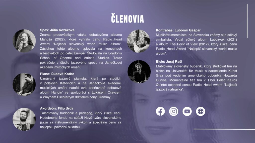 Kapela: Júlia Kozáková/spev, Ľudovít Kotlar/piano, Filip Urda/akordeón, Ľubomír Gašpar/kontrabas, Juraj Raši/bicie.